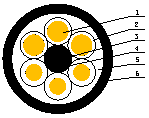 1、鍍錫軟銅導體 2、乙丙絕緣層 3、中心加強件 4、加強件緩沖護層 5、乙丙內(nèi)護填充 6、TPU加強外護層